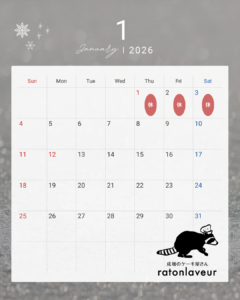 クリスマス年末年始営業のお知らせ 2025年12月20日 最終更新日時 : 2025年12月20日 seri クリスマス期間(12/20〜25)はご予約クリスマスケーキのお渡しと焼き菓子の販売のみとさせていただきます。ショーケース内のピースケーキ販売はございません。お気をつけください。 また、変則ではありますが12/22、12/26をお店のお休みとさせていただきます。 年内は12/28(日)まで、年始は1/4(日)からとさせていただきます。 皆様におかれましてはご不便をおかけしますがどうぞよろしくお願いいたします。 ratonlaveur 店主Follow me!FacebookXBlueskyHatenaPocketCopy